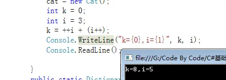 int k = 0; int i = 3; k = ++i + (i++); Console.WriteLine("k={0},i={1}", k, i);