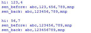 import re sen = "abc,123,456,789,mnp" p = re.compile("\d+,\d+?") for com in p.finditer(sen): mm = com.group() print "hi:", mm print "sen_before:", sen sen = sen.replace(mm, mm.replace(",", "")) print "sen_back:", sen, '\n'