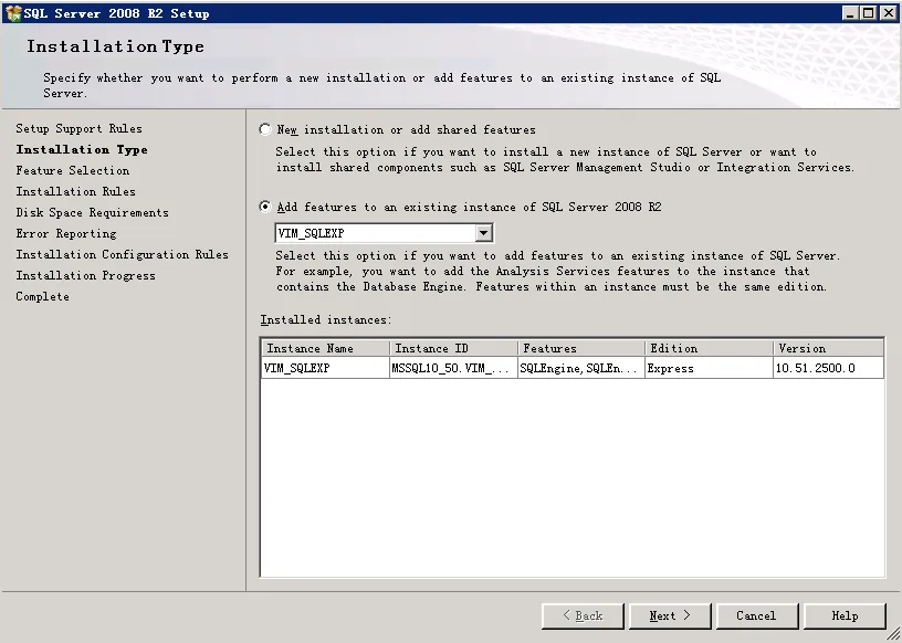 - 选择Add fetures to an exisiting instance of SQL Server 2008
