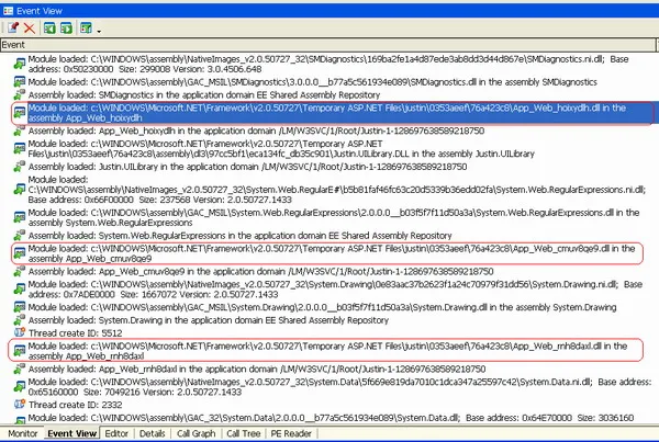 参考上图,看看我们找到了什么,是的,这些就是我们在第一篇文章里就提到过的由ISAPI动态生成的aspx文件对应的类的DLL,这些真是我们需要的,保证准确无误的Modules了!