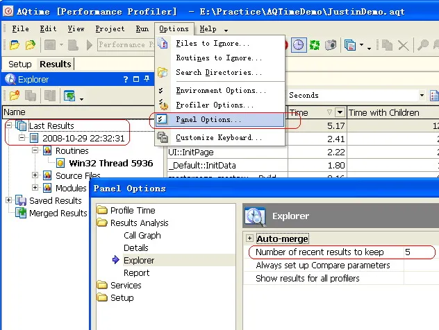 如上图所示,在AQTime里是可以通过Panel Options里的"Number of recent results to keep"来设置这个默认值的,所以请大家记住,安装完AQTime以后,记得先把这个值设置大一些,比如100应该足够了!
