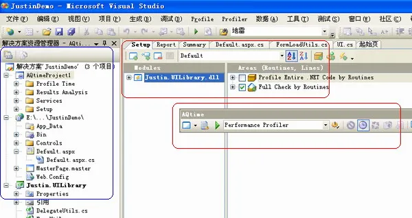 AQTime在安装的时候,会提示是否作为PlugIn关联到Visual Studio环境,如果安装了,那么在VS的ToolBar里就会多出一个Profiler菜单,通过这个菜单,可以进入一个完全嵌入在VS IDE环境中的AQTime环境,用法跟单独打开的AQTime没什么区别,暂时我们感觉到的最大的区别就是没有[Editor]页签,在Grid列表上双击某个方法,如果是当前项目的,就会自动定位到对于的文件上,这样查看和修改源代码确实会比较方便,其他就没什么感觉了,具体可参考下面的图示。