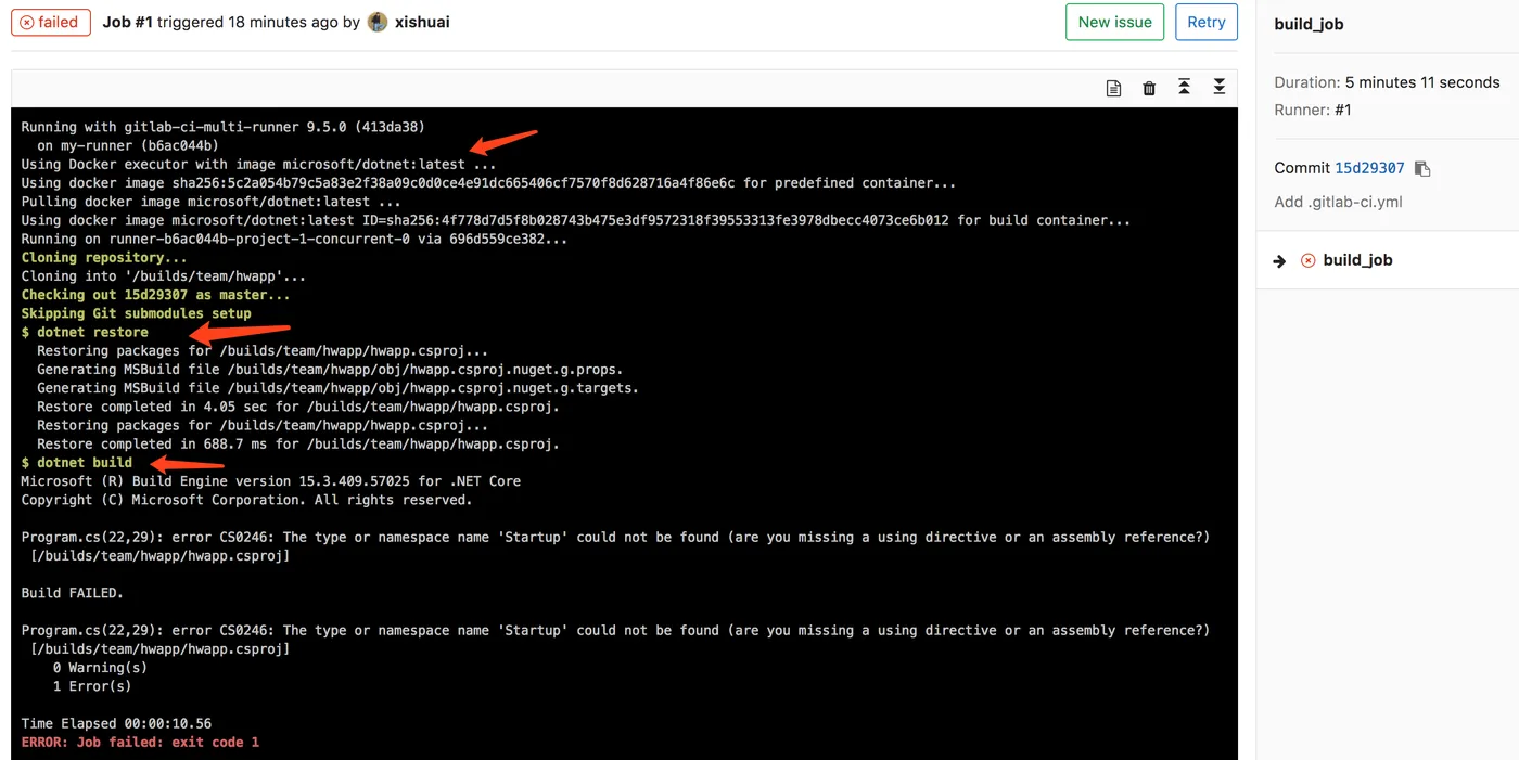 microsoft/dotnet:latest是我们一开始配置 GitLab Runner 填写的 Docker Image,并且 Runner executor 选择的是docker,也就是说 GitLab Runner 的构建环境是docker,并且默认使用的镜像是microsoft/dotnet:latest,由此再进行创建相应容器,并在其容器中执行 CI 脚本,从上面的执行过程,我们就可以看出来了。