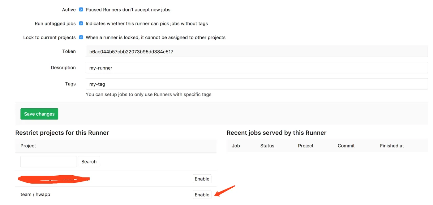 然后点击修改,添加我们需要应用 GitLab Runner 的 Project 项目,示例(点击Enable启用):