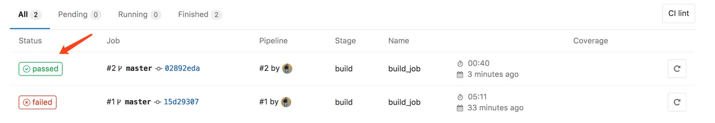 根据错误信息,我们修改下对应代码,重新提交到 GitLab,可以看到这次是构建成功的: