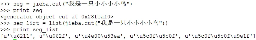 - jieba.cut返回的结构是一个可迭代的generator,可以使用for循环来获得分词后得到的每一个词语(unicode),也可以用list(jieba.cut(...))转化为list
