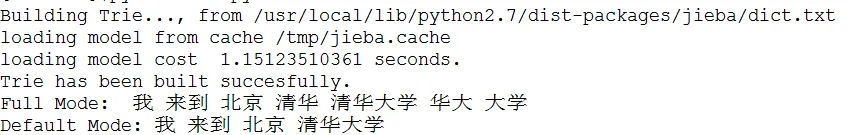 #! -*- coding:utf-8 -*- import jieba seg_list = jieba.cut("我来到北京清华大学", cut_all = True) print "Full Mode:", ' '.join(seg_list) seg_list = jieba.cut("我来到北京清华大学") print "Default Mode:", ' '.join(seg_list)
