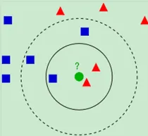 如上图所示(引自wiki),当k=3时,此时红色的个数为2,则绿色的输入实例的类别为红色的三角形,当k=5时,此时蓝色的个数为3,输入实例的类别为蓝色的四边形。