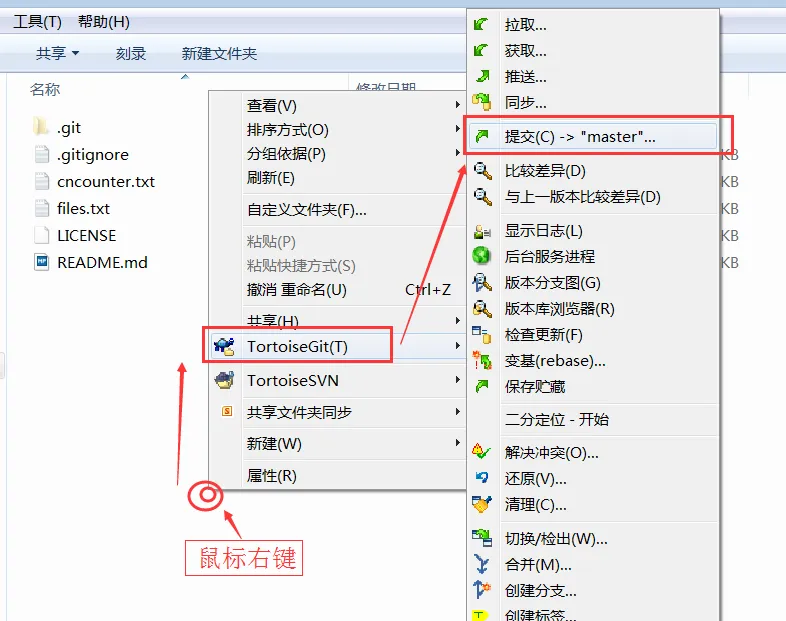然后在本地项目的空白处点击鼠标右键, 选择 TortoiseGit --> 提交(C) -> "master"... 或: Commit -> "master"....