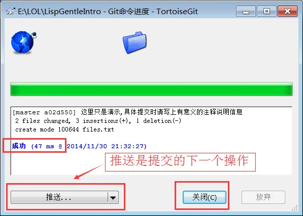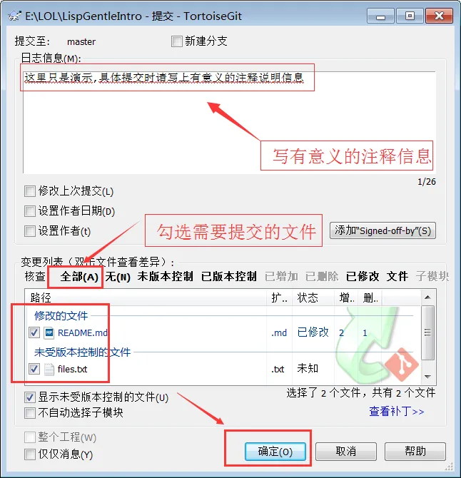 作为好习惯,填写提交日志,勾选需要提交的文件,然后点击 "确定" 按钮, 即提交到本地仓库。