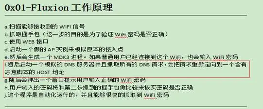 Fluxion需要dhcp动态分配ip给一恶意脚本的主机,随后启动一个模拟的DNS服务器并且抓取所有的DNS请求,会把请求重新定向到一个含有恶意脚本的HOST地址