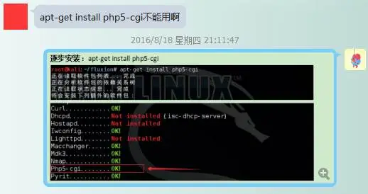 部分网友可能因为kali版本不一样php5-cgi,安装不上,这是我在kali-1.0安装测试图片