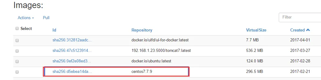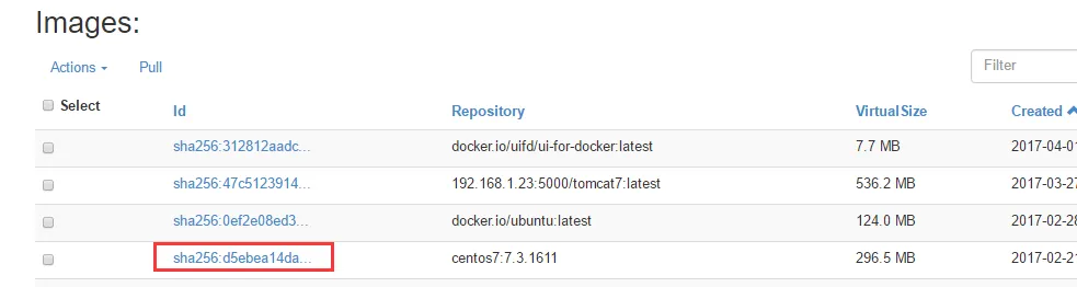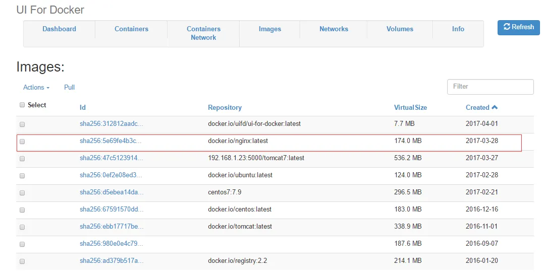 3)images镜像管理。点击Action,可以对已有的镜像镜像移除操作。点击Pull,可以拉取镜像。点击镜像ID进去后可以添加或移除镜像tag