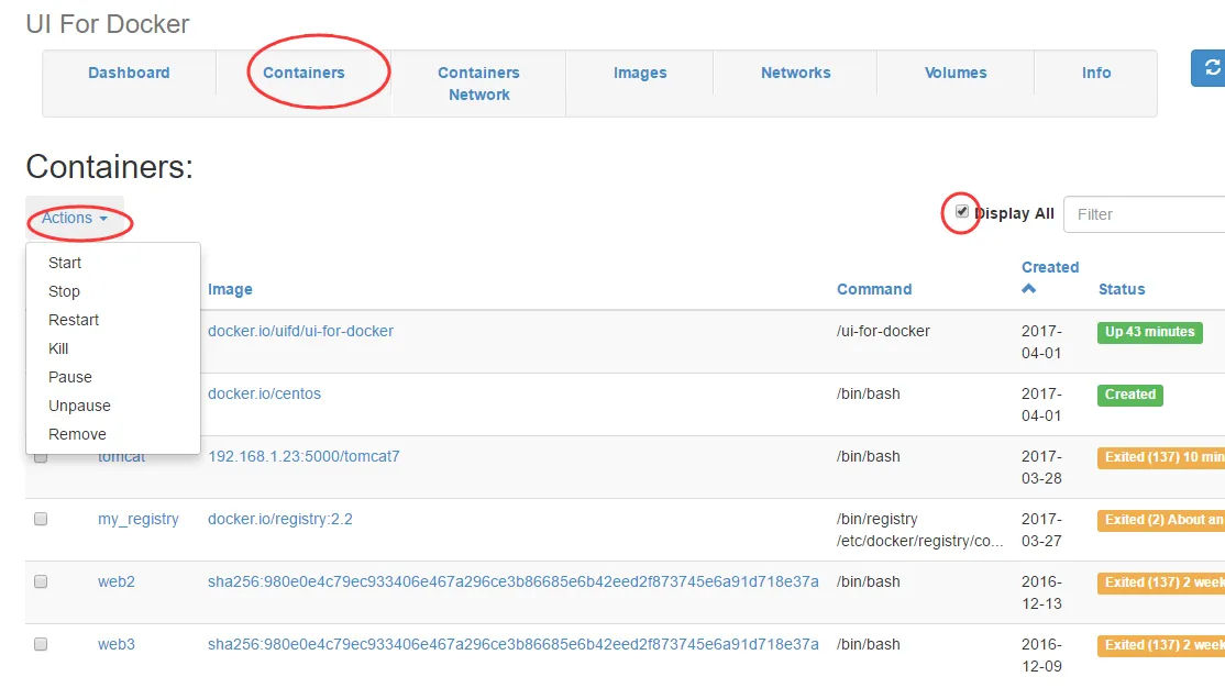 2)container容器管理。点击Display All ,可以显示所有创建了的容器,包括没有启动的。然后点击Action,可以对容器进行启动,关闭,重启,删除,挂起等操作。