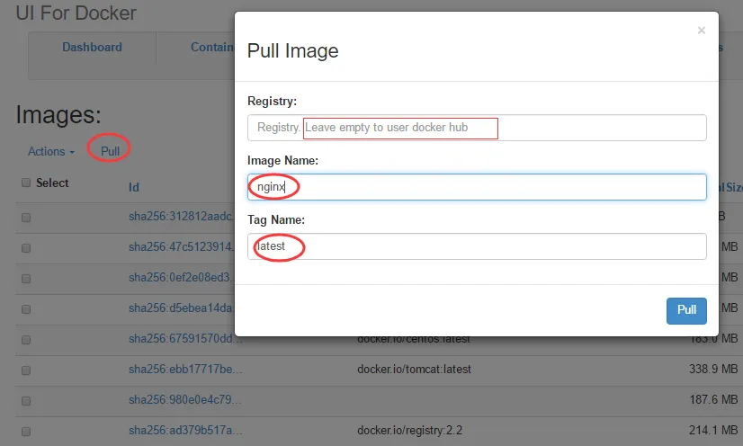 如下截图,Pull镜像的时候,Registry为空,默认从docker hub上拉取镜像。