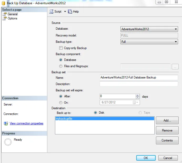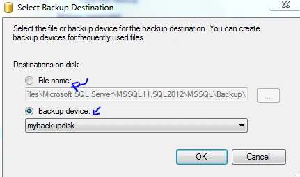 - 我们这里选择的是前面创建的backup device:mybackupdisk。