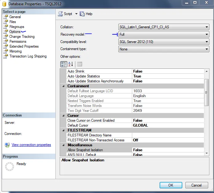 - 右键单击该数据库,再单击“属性”,这将打开“数据库属性”对话框。