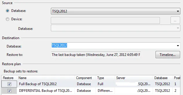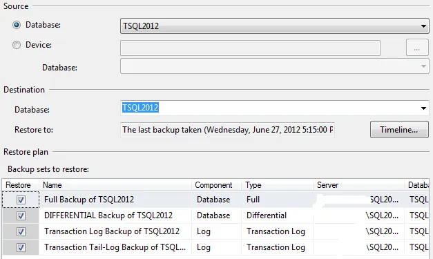 由上图可见,备份中多出我们上述定义的事务日志:Transaction Log Backup of TSQL2012和结尾日志:Transaction Tail-Log Backup of TSQL2012。