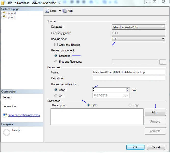 - 点击add选择备份设备或者指定备份路径,如下图所示: