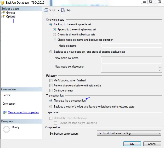 操作步骤跟3.4节完整备份数据库一样,只是将buckup type类型改成Differential而已。destination可以依然选择完整备份的那一个device,不过要求是NOINIT,而不能是INIT,因为如果是INIT的话会覆盖原来的完整备份。