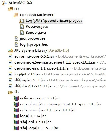 创建project:ActiveMQ-5.5,并导入apache-activemq-5.5.1\lib目录下需要用到的jar文件,项目结构如下图所示: