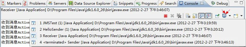 刚开始eclipse1中运行Receiver以后console介面没有任何信息,在eclipse2中运行Sender以后,eclipse2中的console显示如下信息:
