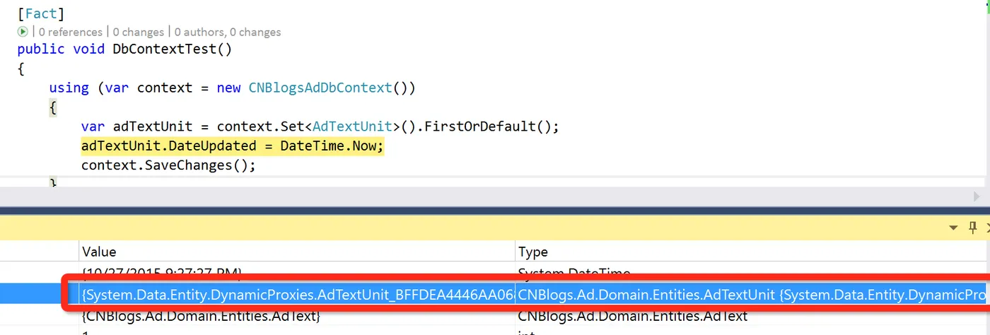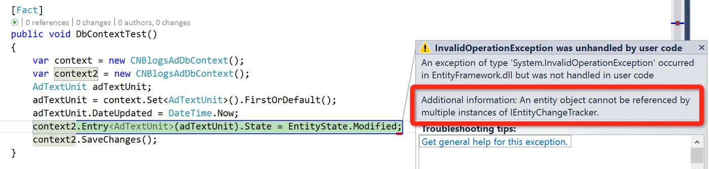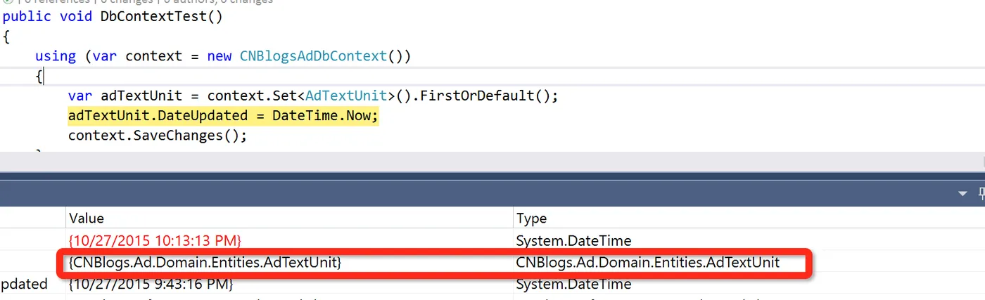 下面我说一下自己的理解,EF 要修改实体对象,需要记录实体对象值的变更,怎么记录的呢?就是通过 EntityChangeTracker(注意上面错误中的 IEntityChangeTracker),比如这段代码 adTextUnit.DateUpdated = DateTime.Now;,如果这个修改操作是在一个 using 中,那 EF DbContext 会通过 EntityChangeTracker 进行记录修改值的变化,具体是怎么记录的?大家可以看下 EF 的源码,我之前有篇博文(《追根溯源:EntityFramework 实体的状态变化》也说了一点点,之前有人问我,EF 修改实体的某一个属性值,最后执行 SQL 的时候,到底是更改一个属性值,还是全部更新呢?我们看一个段简单代码: