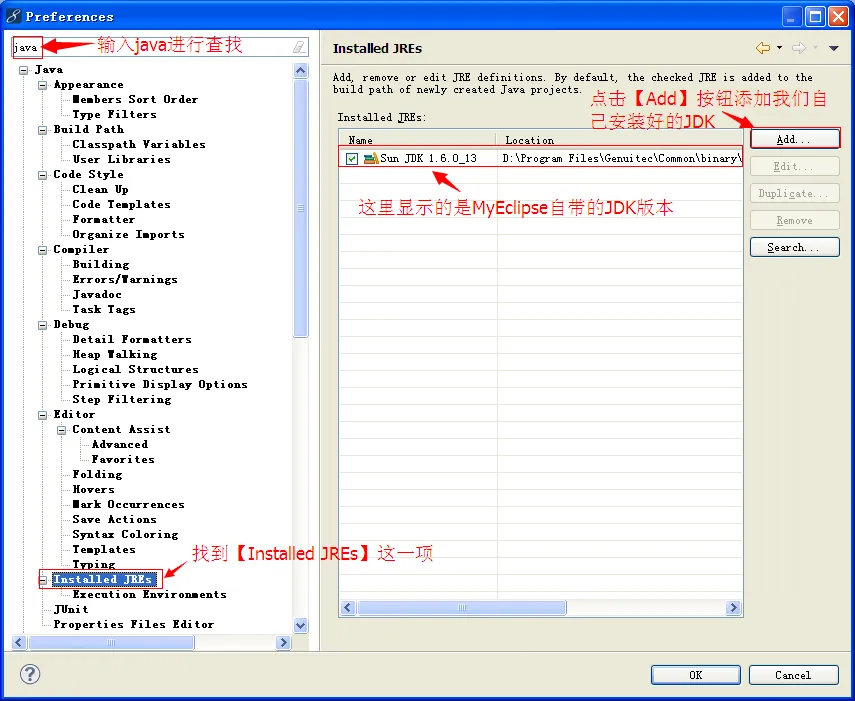 如果我们需要使用自己安装好的JDK,那么就需要在MyEclipse中重新设置,设置步骤如下: