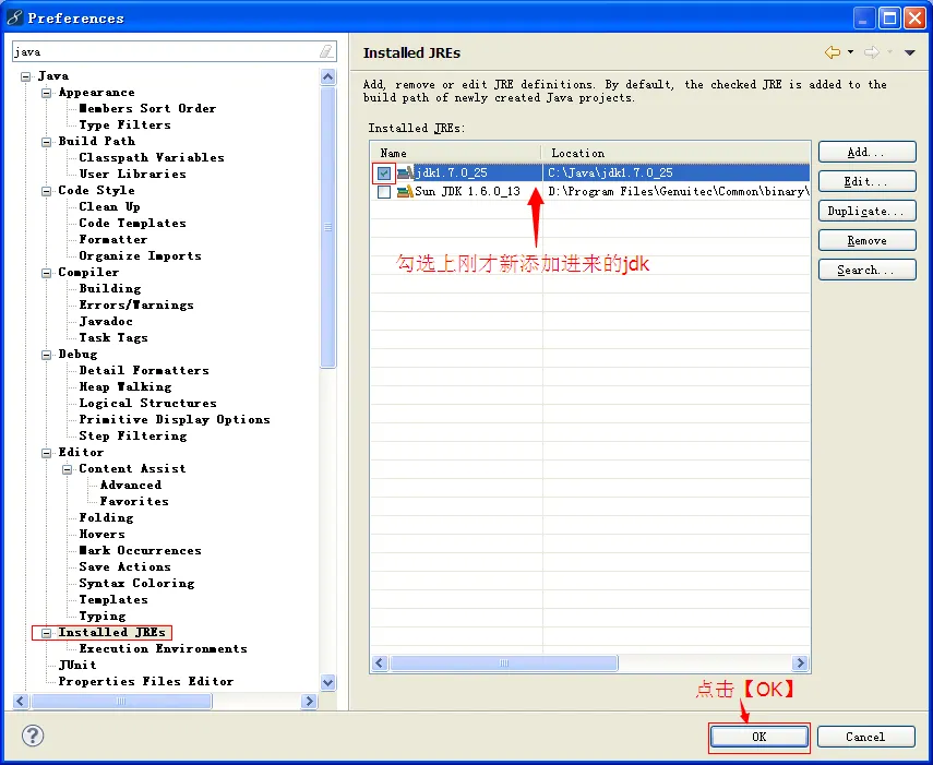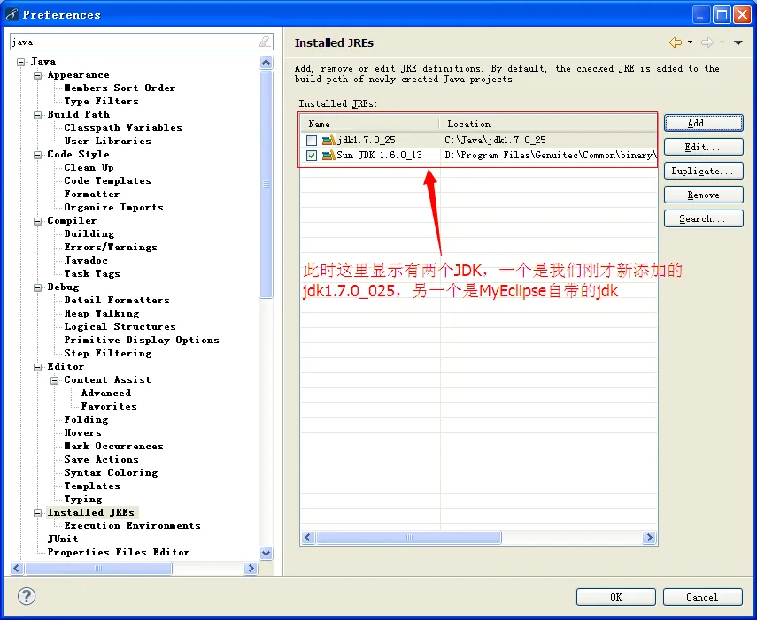 勾选上我们自己的JDK,这样在MyEclipse中开发java项目时使用的就是我们自己的JDK了。