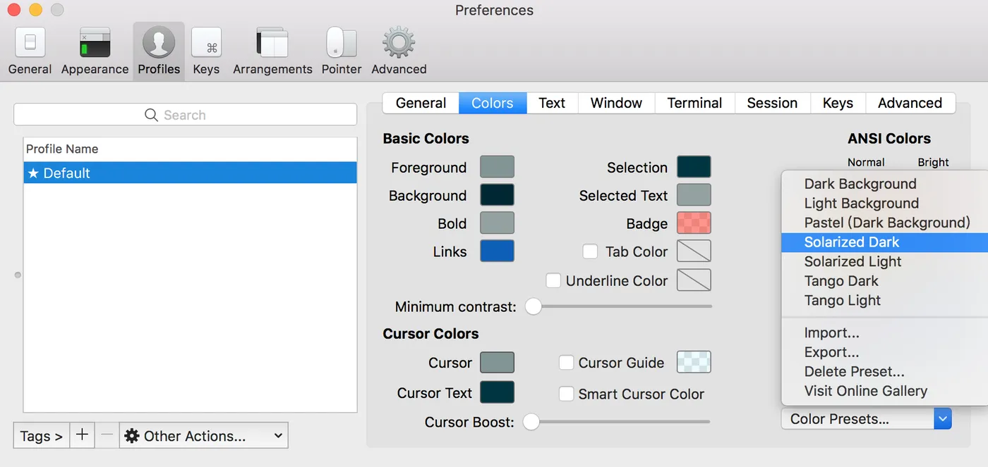 iTerm2 最常用的主题是 Solarized Dark theme,下载地址:http://ethanschoonover.com/solarized