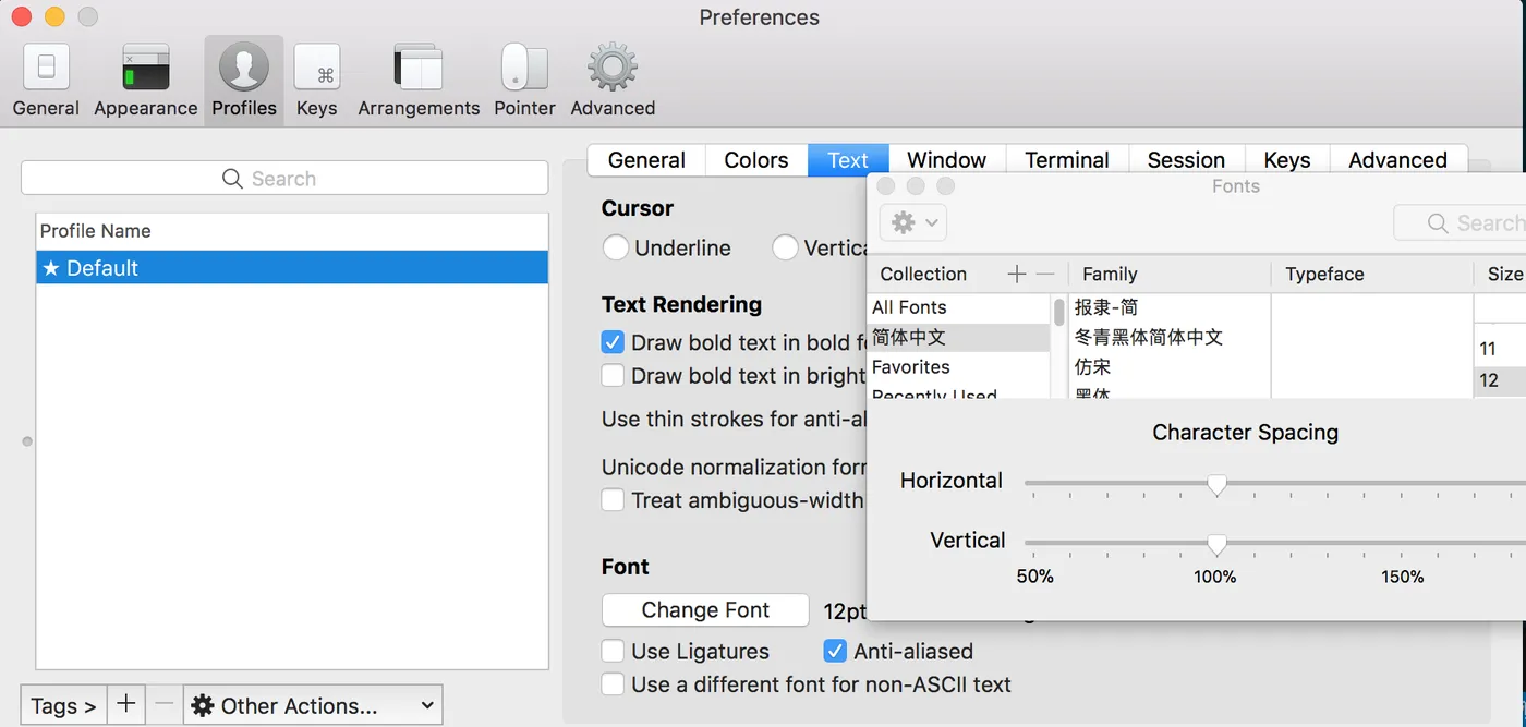 然后打开 iTerm2,按Command + ,键,打开 Preferences 配置界面,然后Profiles -> Text -> Font -> Chanage Font,选择 Meslo LG M Regular for Powerline 字体。