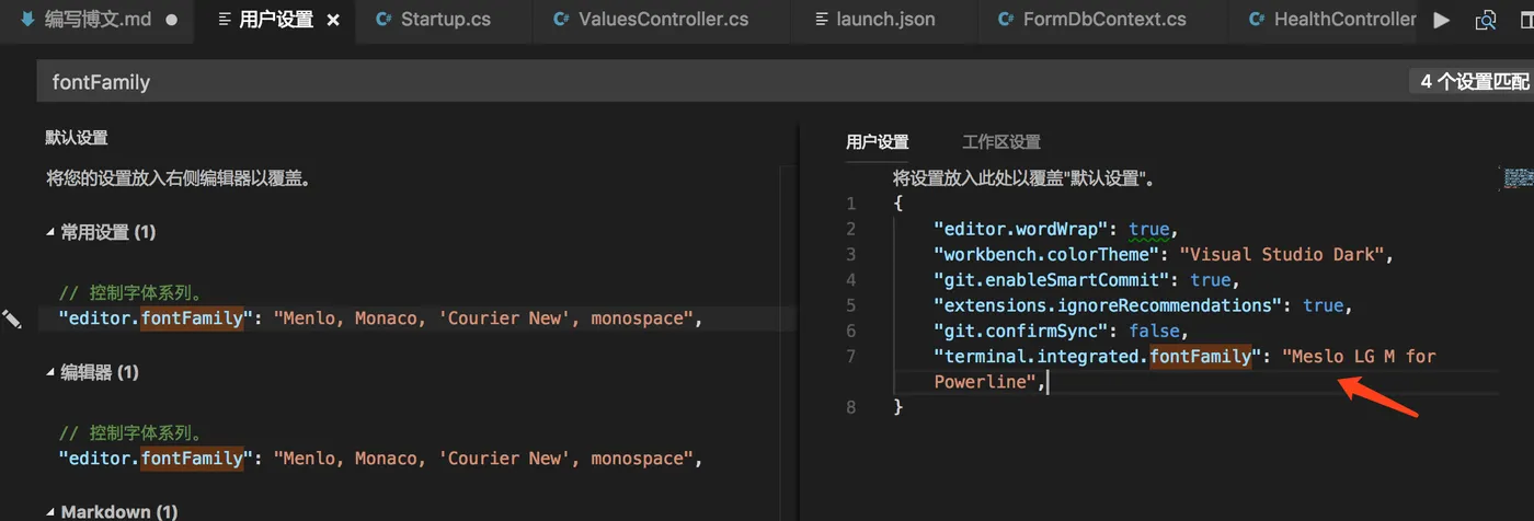 另外,VS Code 的终端字体,也需要进行配置,打开 VS Code,按Command + ,键,打开用户配置,搜索fontFamily,然后将右边的配置增加"terminal.integrated.fontFamily": "Meslo LG M for Powerline",示例:
