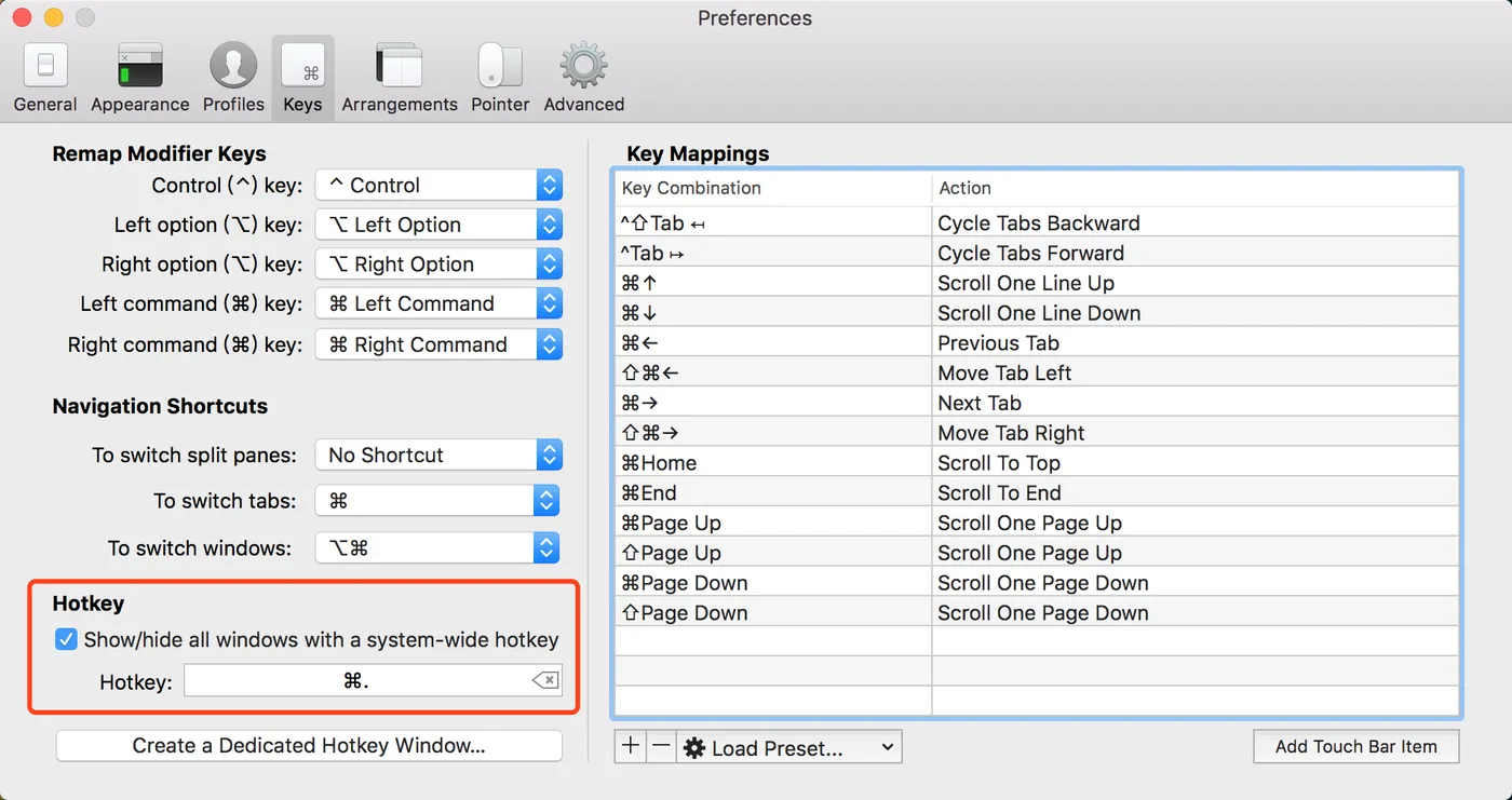 这个功能也非常使用,就是通过快捷键,可以快速的隐藏和打开 iTerm2,示例配置(Commond + .):