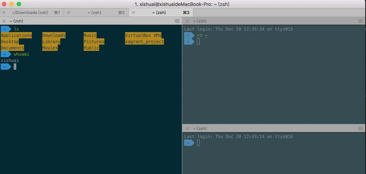 我们可以通过whoami命令,查看当前用户,效果(另外分屏的效果):