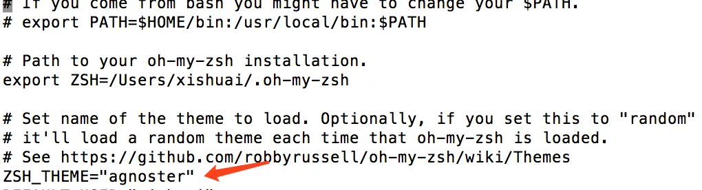 然后,我们编辑vim ~/.zshrc文件,将主题配置修改为ZSH_THEME="agnoster"。