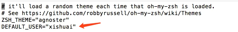 编辑vim ~/.zshrc文件,增加DEFAULT_USER="xishuai"配置,示例: