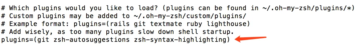 然后编辑vim ~/.zshrc文件,找到plugins配置,增加zsh-autosuggestions插件。