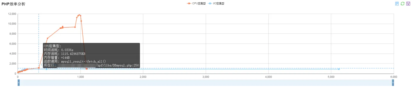 1 <!DOCTYPE html> 2 <head> 3 <meta charset="utf-8"> 4 <title>ECharts</title> 5 </head> 6 <body> 7 <?php 8 function makeData($file) 9 { 10 $fp = fopen($file, 'r'); 11 $arrLineData = []; 12 $arrDetailData = []; 13 14 while(!feof($fp)){ 15 $row = fgets($fp); 16 $row = trim($row); 17 $arr_now = preg_split('#\s+#', $row); 18 19 if (count($arr_now) > 2 && is_numeric($arr_now[0])) { 20 $x = $arr_now[0]*10000; //时间消耗, 变成整数, 单位ms*10 21 $y = $arr_now[1]/1000; //内存消耗, 缩小数量级, 单位KB 22 $arrLineData[] = [$x, $y]; 23 24 $tmp = []; 25 $tmp['time_used'] = $arr_now[0]; 26 $tmp['memory_used'] = $arr_now[1]; 27 $tmp['memory_add'] = $arr_now[2]; 28 $tmp['function'] = $arr_now[4]; 29 $tmp['location'] = $arr_now[5]; 30 $key = $x.'_'.$arr_now[1]; 31 $arrDetailData[$key] = $tmp; 32 } 33 } 34 35 return [$arrLineData, $arrDetailData]; 36 } 37 38 $cpuData = makeData('./file/trace._test_index_ab_cpu_XDEBUG_TRACE=start_trace.xt'); 39 $ioData = makeData('./file/trace._test_index_ab_io_XDEBUG_TRACE=start_trace.xt'); 40 41 ?> 42 <!-- 为ECharts准备一个具备大小(宽高)的Dom --> 43 <div id="main" style="height:400px"></div> 44 <!-- ECharts单文件引入 --> 45 <script src="./js/echarts-all.js"></script> 46 <script type="text/javascript"> 47 var cpuData = <?= json_encode($cpuData)?>; 48 var ioData = <?= json_encode($ioData)?>; 49 var line1Name = 'CPU密集型'; 50 var line2Name = 'I/O密集型'; 51 52 // 基于准备好的dom,初始化echarts图表 53 var myChart = echarts.init(document.getElementById('main')); 54 55 option = { 56 title : { 57 text: 'PHP效率分析', 58 //subtext: '纯属虚构' 59 }, 60 tooltip : { 61 trigger: 'axis', 62 axisPointer:{ 63 show: true, 64 type : 'cross', 65 lineStyle: { 66 type : 'dashed', 67 width : 1 68 } 69 }, 70 formatter : function (params) { 71 var x = params.value[0]; 72 var y = params.value[1]; 73 74 var key = x+'_'+y*1000; 75 if (params.seriesName == line1Name) { 76 var obj = cpuData[1][key]; 77 } else { 78 var obj = ioData[1][key]; 79 } 80 str = params.seriesName+': <br>'; 81 str += '时间消耗: '+obj.time_used+"s<br>"; 82 str += '内存消耗: '+obj.memory_used/1024+"KB<br>"; 83 str += '内存增量: '+obj.memory_add+"B<br>"; 84 str += '函数调用: '+obj.function+"<br>"; 85 str += '所在行: '+obj.location; 86 return str; 87 } 88 }, 89 dataZoom: { 90 show: true, 91 start : 0 92 }, 93 legend: { 94 data:[line1Name, line2Name] 95 }, 96 toolbox: { 97 show : true, 98 feature : { 99 dataView : {show: true, readOnly: true}, 100 restore : {show: true}, 101 saveAsImage : {show: true} 102 } 103 }, 104 calculable : true, 105 xAxis : [ 106 { 107 type: 'value', 108 axisLine: { 109 lineStyle: { 110 color:'grey', 111 width:1 112 } 113 } 114 } 115 ], 116 yAxis : [ 117 { 118 type: 'value', 119 axisLine: { 120 lineStyle: { 121 color:'grey', 122 width:1 123 } 124 } 125 } 126 ], 127 series : [ 128 { 129 name:line1Name, 130 type:'line', 131 data:cpuData[0], 132 }, 133 { 134 name:line2Name, 135 type:'line', 136 data:ioData[0] 137 } 138 ] 139 }; 140 141 // 为echarts对象加载数据 142 myChart.setOption(option); 143 </script> 144 </body> 145 </html>