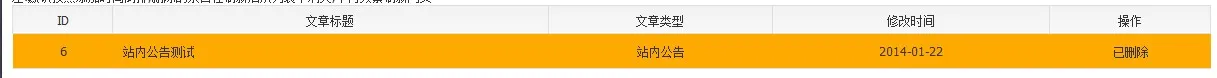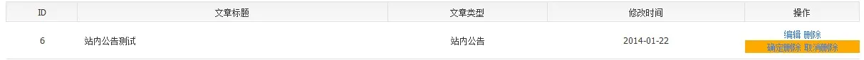 1 <div> 2 <table> 3 <tr> 4 <th>标题</th> 5 <th>操作</th> 6 <th></th> 7 </tr> 8 <{foreach from=$listNews item=news}> 9 <tr id="item_<{$news.id}>"> 10 <td><{$news.title}></td> 11 <td id="item_op_<{$news.id}>"> 12 <a href="javascript:;" onclick="del(<{$news.id}>);">删除</a> 13 </td> 14 <td> 15 <span id="del_confirm_<{$news.id}>" style="display:none"> 16 <a href="javascript:;" onclick="delConfirm('<{$controllerUrl}>/ajaxdelnews', <{$news.id}>, <{$aid}>)">确定删除</a> 17 <a href="javascript:;" onclick="delCancle(<{$news.id}>)">取消删除</a> 18 </span> 19 </td> 20 </tr> 21 <{/foreach}> 22 </table> 23 注:默认按照添加时间倒排,删除的条目在刷新后从列表中消失,不再频繁刷新网页 24 </div> 25 <script type="text/javascript"> 26 function del(itemid) 27 { 28 var spanDelConfirm = document.getElementById('del_confirm_'+itemid); 29 spanDelConfirm.style.display='block'; 30 spanDelConfirm.style.background='#FFAA00'; 31 } 32 33 function delConfirm(url, itemid, areaid) 34 { 35 var jsonNewsInfo = {id:itemid,aid:areaid}; 36 var flag = $.post(url, jsonNewsInfo); 37 flag.done( 38 function (data) { 39 if (data == 'true') { 40 document.getElementById('item_op_'+itemid).innerHTML='已删除'; 41 document.getElementById('del_confirm_'+itemid).innerHTML=''; 42 document.getElementById('item_'+itemid).style.background='#FFAA00'; 43 }; 44 } 45 ); 46 } 47 48 function delCancle(itemid) 49 { 50 document.getElementById('del_confirm_'+itemid).style.display='none'; 51 } 52 </script>
