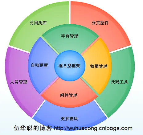 下面图示是我的基于传统访问数据库方式和分布式WCF数据服务访问方式的一个模块分析图,围绕着混合型框架的核心,我们可以构建很多松散耦合的模块,从而能够为我们Winform应用的开发集成提供更高的开发效率。