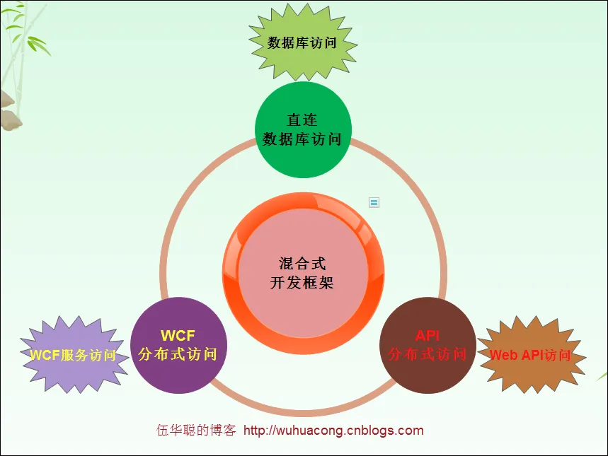 也就是新型的混合式开发框架,除了直连数据库访问的传统模式,WCF分布式访问的WCF服务访问模式,还可以接入API分布式访问的Web API接口模式,他们的关系构成了一个完整的Winform应用体系,如下图所示。
