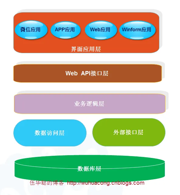 从上图我们可以看到,整个外围的应用场景围绕着Web API核心层构建,如果我们把它换一种方式表达,那么也就是下面的设计图示,我们把微信应用、APP应用、Web应用、Winform应用,作为Web API接口层上面的一个界面应用层来处理,这样就是基于一个API接口层,接入多个或多种方式的界面应用层,从而构建企业丰富的数据服务应用。