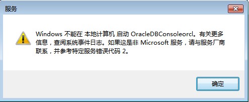 https://localhost:1158/em 无法显示页面,在网上查阅资料以后发现这个页面时由服务:OracleDBConsoleoracl控制的,所以到管理界面打开服务:OracleDBConsoleoracl。但是启动OracleDBConsoleoracl服务的时候报错:Windows不能在本地计算机启动OracleDBConsoleorcl。有关更多信息,查阅系统事件日志。如果这是非Microsoft 服务,请与服务厂商联系,并参考特定服务错误代码 2。 如下图所示。