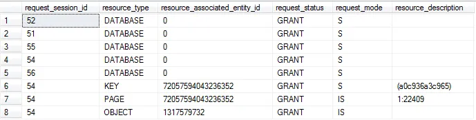 查询锁状态的结果如下图所示,我们发现在KEY上面加了S锁,在Page和Object上面加了IS锁,这是因为在Repeatable Read级别下S锁要在事务执行完以后才会被释放。