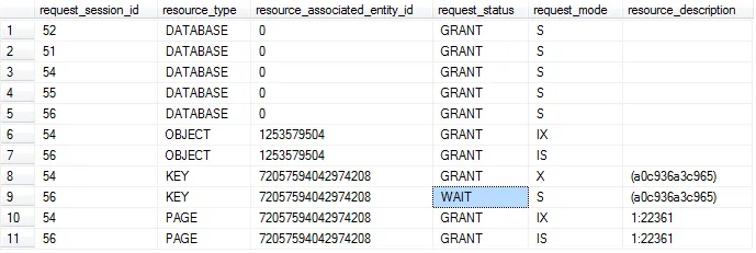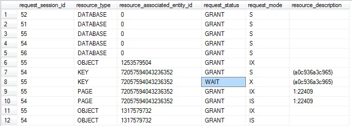 --step6:开启第二个事务 BEGIN TRAN tran2; --step7:修改VacationHours,需要获得排它锁X,在VacationHours上没有有S锁 UPDATE Employee SET VacationHours = VacationHours - 8 WHERE EmployeeID = 4; --step8:查看当前加锁情况 SELECT request_session_id, resource_type, resource_associated_entity_id, request_status, request_mode, resource_description FROM sys.dm_tran_locks