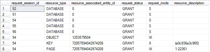 在开启另外一个update事务以后,我们再去查看当前的锁状况,如下图所示,我们发现在表(Object)级别上加了IX锁,在这张表所在的Page上也加了IX锁,因为表加了聚集索引,所以在叶子结点上加了X锁,这个锁的类型是KEY。