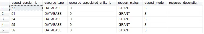 查看锁的情况如下图所示,我们发现在只有在数据库级别的S锁,而没有在表级别或者更低级别的锁,这是因为在Read Committed级别下,S锁在语句执行完以后就被释放。