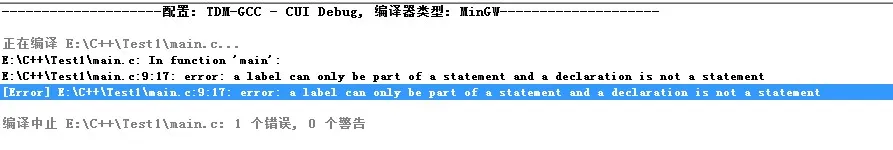 报的错误意思是在该标签下不能定义变量。为什么呢?原因很简单,在C语言中所有的变量定义都必须放到所在语句块的最前面。所以如果改成这样: