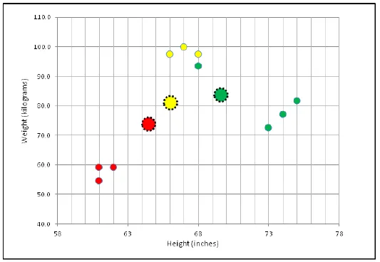 通过按照身高和体重的聚类,可以将上述 10 条数据分组成 3 类。