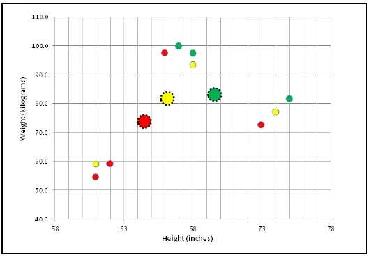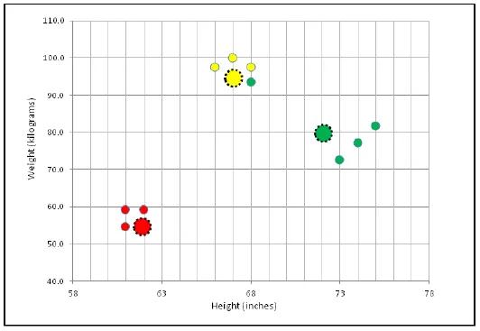 分类结果可以描述为:中等身高并且很重、很高并且中等体重、矮并且轻。如果用图形来观察分组状况则结果一目了然。